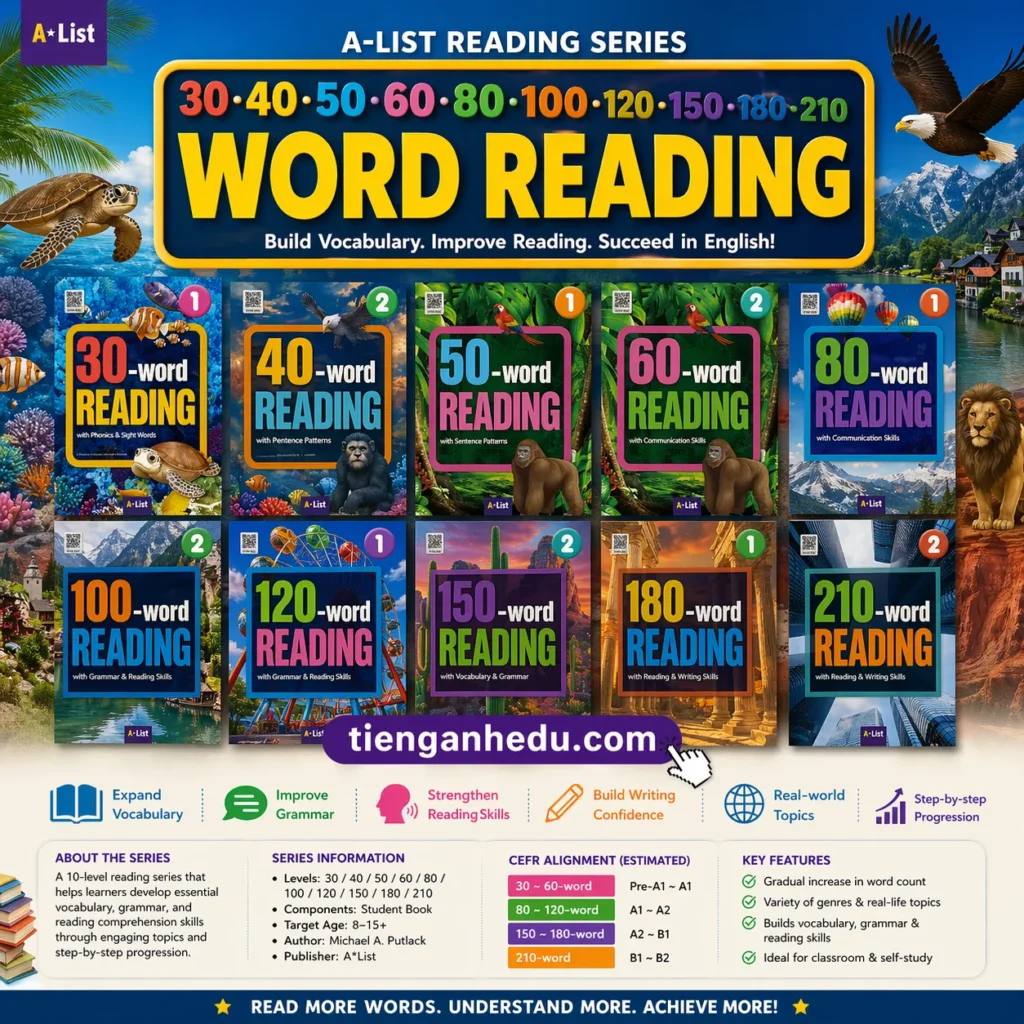 Word Reading is a structured multi-level English reading series designed to build vocabulary, grammar, and comprehension skills step by step. From 30-word to 210-word passages, learners gradually improve their reading fluency and confidence through engaging topics, real-life contexts, and skill-based exercises.